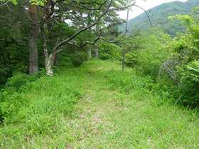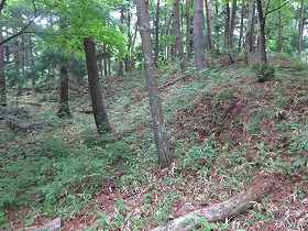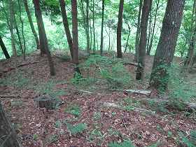 | 2郭内部。尾根を削平したもので、南北に長い。 | 2郭先端部の堀切。 |