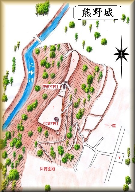 1郭には秋葉神社が祭られており、また城に関する案内板も設置されていた。それによると、室町時代の応永年間(1394〜1427)、平惟茂の孫であった市野瀬兵庫正保がこの地に城を築いて熊野城と称したことに始まるという。