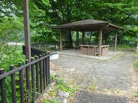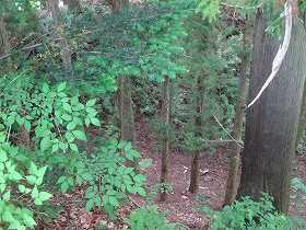 | 先端部の東屋。 | 東側の堀切跡。この下を降りていったところに中央構造線がある。 |