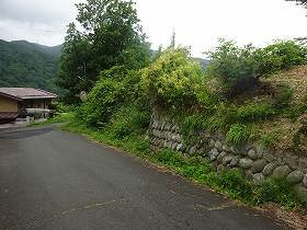 というのも、城は背後の道路よりも一段と低くなっている先にあり、山林化しているために、どこが城址であるか見当を付けにくいのである。通常、城址というのは一段高い地形にあるので、それによってどこであるかすぐに分かるのであるが、この城は穴城とでもいうべきか、背後の道路よりも低い位置にあるのである。しかも入口の案内表示など何もない。これではなかなか見つけられないはずである。
