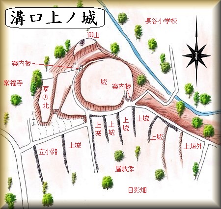 溝口上ノ城、下ノ城という2つの城郭が近接して存在しているわけなのだが、両者は一体化した城郭ではなく、対立しあう関係にあったようである。