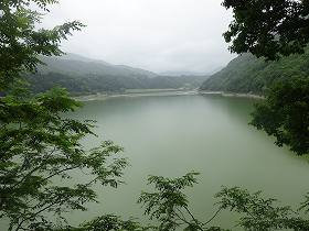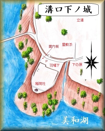 | 入口の駐車場が堀跡らしい。 | 先端部から見る美和湖。 |