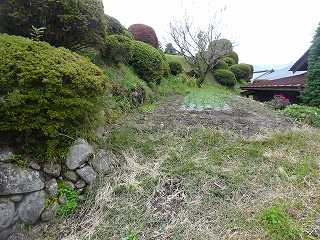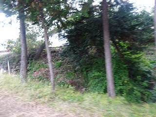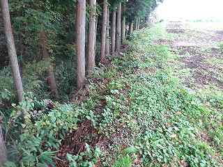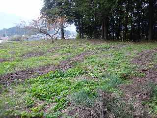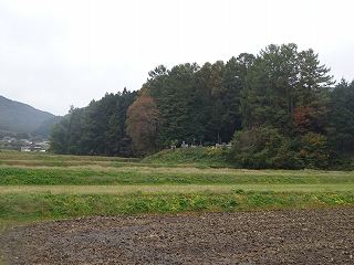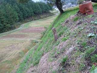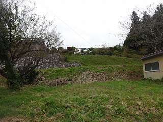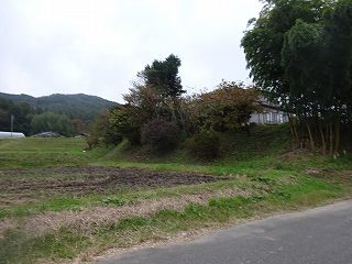 | 北東側から遠望する竹松城。それらしい城塁が見えている。墓地になっているのは4郭の東側部分である。 | 3郭西側の城塁。 |