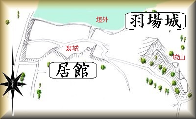 伊那市富県7909番地辺りの微高地が羽場城の居館の跡であり、その西側250mほどにある山稜が城山と呼ばれている。城山の構造物の規模は小さそうだが、堀切も2本認められるようだ。