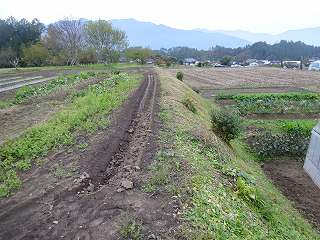 | 下牧古城の南東側の城塁。一部に石積みが見られる。 | 西側の堀はほとんど埋められてしまっている。 |