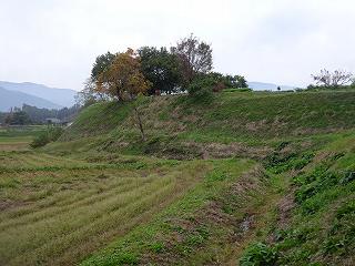 | 二重堀切の二重目。 | 4郭西側の城塁。手前の水田は水堀の跡であろう。 |