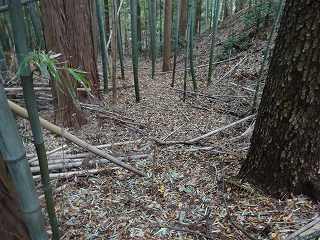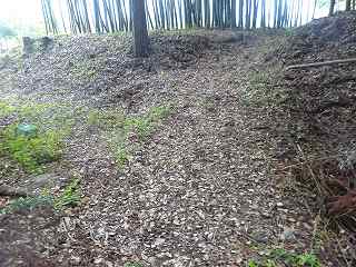 | 町屋部分の城塁。 | 民家の上の竹ヤブの奥に残されている堀の残欠。かなり大規模なものである。 |