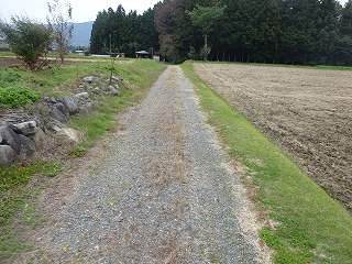 町屋城は伊那市春近8067番地のお宅辺りにあった。安岡城から西方に進んで行くと、途中で広域農道と合流する。その地点の向かい側にちょっとした土手が見えているが、これが町屋城の土手であったかもしれない。