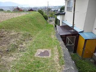 | 1郭南側の城塁。石垣が見えるが、往時のものであろうか。 | 北側の堀跡はほとんど埋められてしまっている。 |