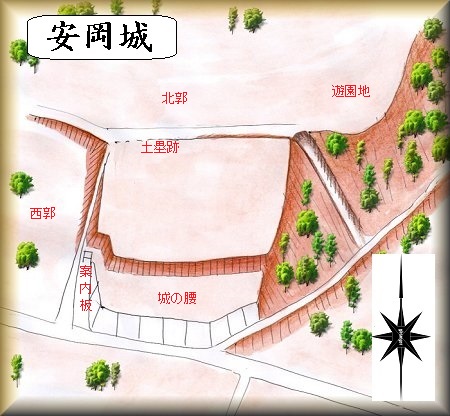 城の西側に回り込んで行くと、台地上に登って行く道があり、これを進んで行く途中に安岡城の案内板と城址碑が建てられている。1郭城塁には、腰巻石垣が見られる。遺構のように見えるのだが、実際はどうなのであろう。