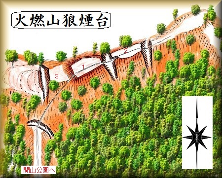 しかし、地形図を見てみると、西側の中腹にある関山公園から尾根伝いに行けば、距離こそは長いが傾斜は緩やかで、それほど苦労せずに到達できそうである。ということで上の段城から関山公園を目指していくことにした。果たして火燃山までの道は付けられているのであろうか。