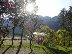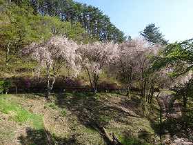 話は変わるが関山公園には枝垂れ桜が咲き乱れており、これがとてもきれいであった。桜を後ろにして、公園の一番奥の所から背後の山稜に登って行く道が見えている。これを登って行く。最初の比高50mほどはわりと急な山道である。