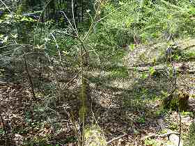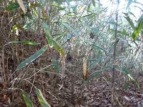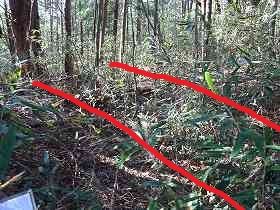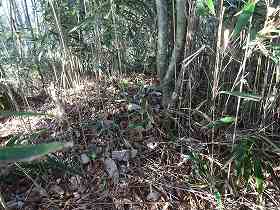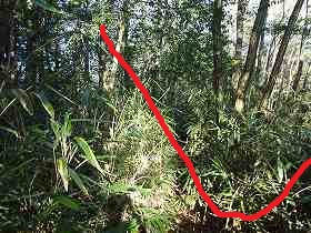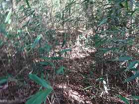 | 笹薮の中を進んでいくと、1郭の南側の虎口に入る。写真は虎口脇の土塁。 | 1郭東側の堀切。 |