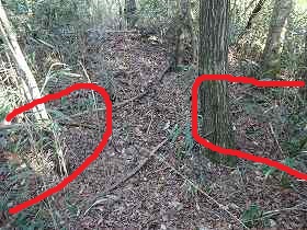 この辺りの上方から城の遺構が展開している。後はまっすぐに進んでいけばよいのであるが、登城道は途中から城内に登るようにはなっておらず、まっすぐ進むと、城の最西端の所に出るようになっている。