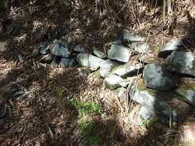 後は山道を登って行くだけである。登って行くと道が大きくカーブするところとまっすぐに登るところに分岐する地点がある。どちらを選んでも同じところに出るのであるが、時間短縮のためにまっすぐ登って行く。その先に進んでいったところの脇に石垣が積まれていた。遺構なのかどうかはっきりしないが、遺構だとすればこの辺りに門を置いていたのかもしれない。