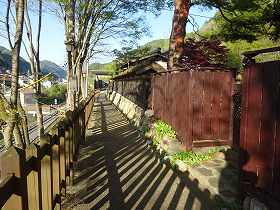 | 木曽氏館周囲の石垣。上は福島小学校。 | 隣接する山村代官屋敷の入口の石垣と門。 |