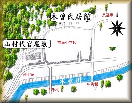 福島城の山麓にある福島小学校が木曽氏館の跡であり、隣接して山村代官所もある。山稜と木曽川に囲まれた要害地形である。