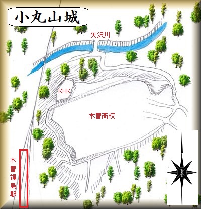 小丸山城は、福島にある木曽氏関連の城館の中でも最も古いものである。応永年間に須原から福島に居城を移転した木曽親豊が最初に築いたのが小丸山城であった。後に木曽氏は上の段城、向城、福島城などを築いて、この福島の谷間から勢力を拡大させていくことになる。