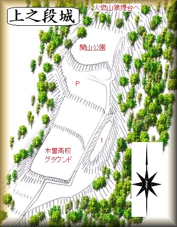 福島関所の上方、関山公園の下の木曽高校グランドになっている個所が、上の段城であるといい、googlemapにも掲載されている。