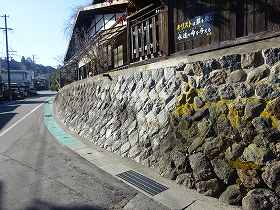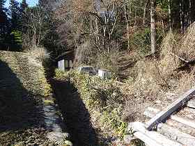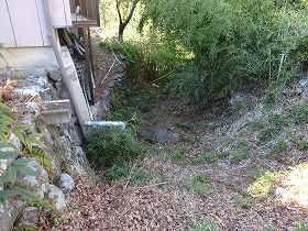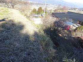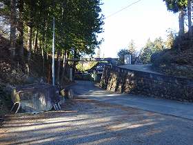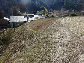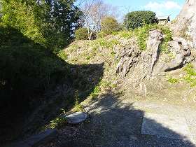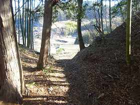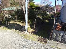 | 3郭にある民家への入口。切岸は後世の石垣でおおわれている。 | 1郭北側の堀切。 |