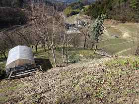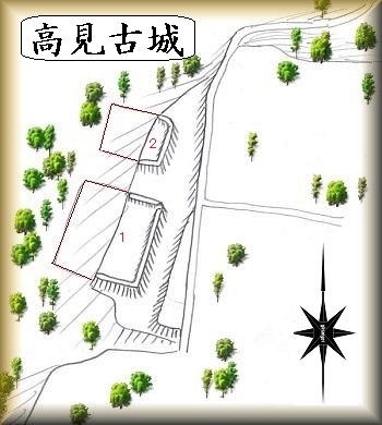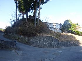 高見古城は、県道49号線の新宮川岸という交差点の南西300mほどの所にあった。場所がちょっと分かりにくいので気を付けてアクセスした方がよい。南側の台地に上がり、そこからさらに南側の台地に上がったところの住宅地の脇である。南側に上がる道は比較的細い道であるが、注意して登れば車で進んで行ける。やがて鉄塔が見えてくるので、そのまま進んで行けば、城址が見えてくる。