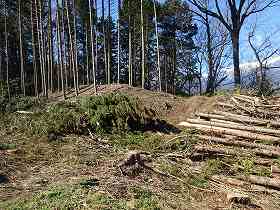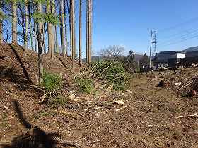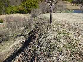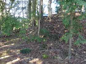| 城畑東側の城塁。正面奥の森が城畑である。 | 城畑の堀切。小規模ながらしっかりと掘り切っている。 |