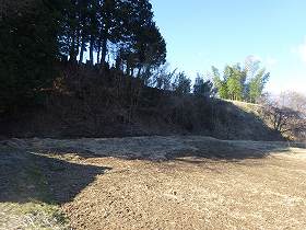 1郭の城塁は8mほどであるから、すぐに登れる。登ったところが墓地になっており、またそれ以外の部分は一面の畑となっている。1郭の規模は60m四方ほどで、まとまった空間となっている。周囲は切岸加工されているが、土塁は見られない。