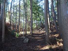 この道を上まで登って行ったところに小さな堀切があり、その南側の最高所が1郭である。この辺りにちょっとしたスペースがあったので、車はそこに停めさせていただいて、1郭周辺を散策してみる。