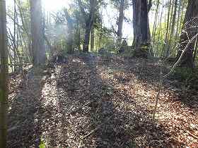 | 城畑の郭内部。いくつかの墓碑がある。 | 外城の城塁。後世の石垣で囲まれている。 |