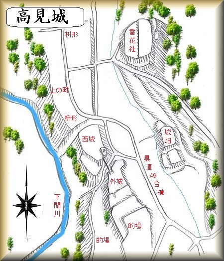 高見城は、香花社の南側一帯にあった。地図上で目立つのはこの神社くらいなので、まずは香花社を目指していくのがよいであろう。
