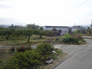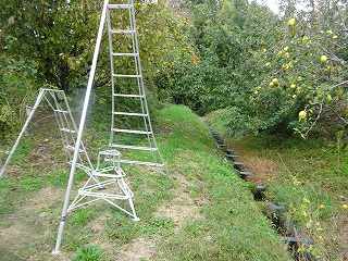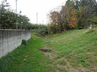 この辺り一帯はリンゴ畑となっている。この中を西側の土手方向に向かって進んで行くと、窪んだ地形が見えてくる。これが東側の堀である。堀はだいぶ埋められてしまっているようで、深さも2m程度、城塁も緩やかになってしまっている。また、東側はコンクリートで固められてしまっていて、形状はかなり改変されているが、それでも堀としての形状を維持している。
