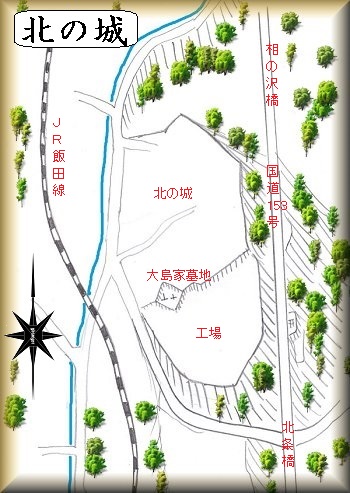 北の城は、大島氏の居城の1つであったと言われる。大島城の北方にあることから北の城と呼ばれるようになったものであろうか。