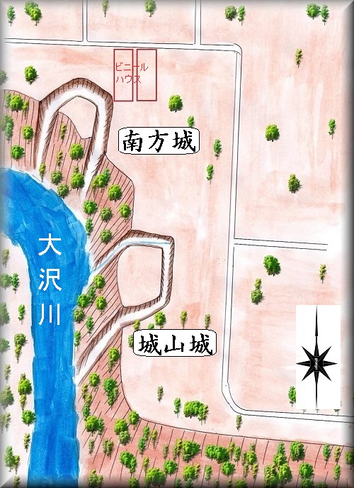 一方の南方城は、城山城の北西300mほど、やはり、大沢川に臨む断崖に築かれていた。こちらも、北側の道路から少し入り込んだところであるので、場所を把握するのが難しい。城の手前にはビニールハウスがあるので、これを目印とするのが分かりやすい。