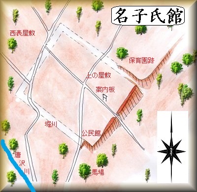 名子氏といえば、名子城の城主として知られているのだが、名子城を築く以前の古い時代の居館がこの場所にあったということなのであろう。中世領主の城館らしく、規模は80mほど四方のものであったようだ。