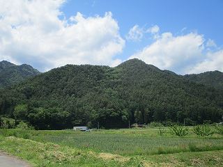 | 南東側から遠望する観勝院山城。ここからの比高は200mほどある。 | 観勝院跡の入口。柵を開けて入って行く。 |