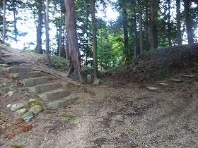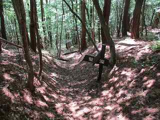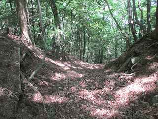 | 結局、斜面直登をして、やっと1郭北側の大堀切のところまで来た。 | 大堀切からさらに上の物見を目指していく。 |