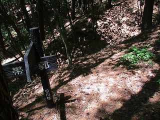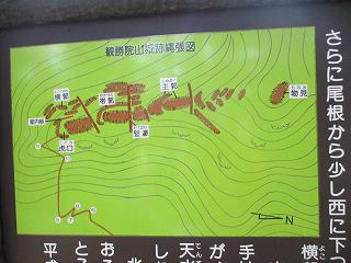 最後の堀切を渡った先が5郭。ここから先端に降りていったところに下り口の案内表示があった。これで城内を全部通り抜けたわけである。基本的には直線連郭式の単純な構造の山城であるのだが。造成がしっかりとしていて、いかにも恒久的な城郭として建造された城といった印象を受ける山城である。