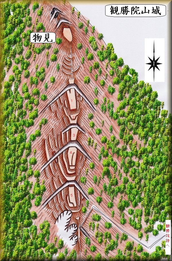 | 観勝院跡にある観勝院山城の案内板。 | 城址への案内が何ヶ所にも立てられているのだが、途中で分からなくなってしまう。 |