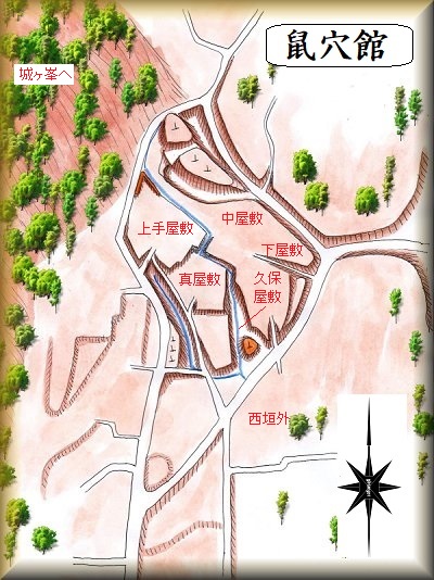 通常、根古屋と言えば、単郭の居館であったりすることが多いのだが、鼠穴館の堀や土塁の形状は複雑であり、単なる居館形状ではない。城域内部には複数の屋敷の名称が残されており、単独の豪族の居館というよりは、複数の名主が共存した屋敷の複合体といった構造をしていたようだ。実際に、上手屋敷、真屋敷、中屋敷、下屋敷、久保屋敷といった名称がそれを示している。