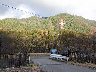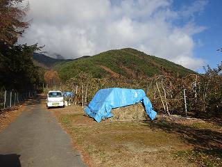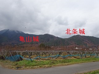 | 南側から遠望する亀山城(手前の山)。奥に高くそびえているのが北条城である。 | 上の原西部農村広場に車を停めて、すぐ前のこのゲートを開けて内部に入って行く。獣道のような道を進んで行くと北条城との間の分岐点に差し掛かる。 |
