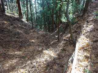 ここから西側に進んで行くと、2郭との間には深さ6mほどの堀切があった。なかなか鋭い堀切であり、何かに掴まりながらでないと、足を滑らせてしまう。実際、ここで滑って転んでしまった。