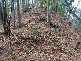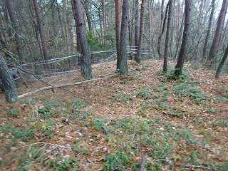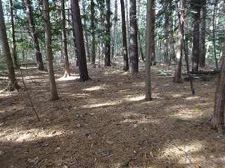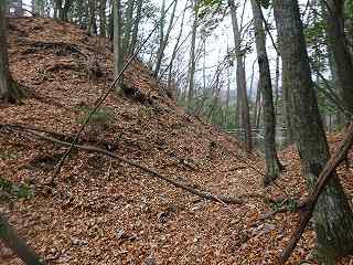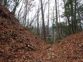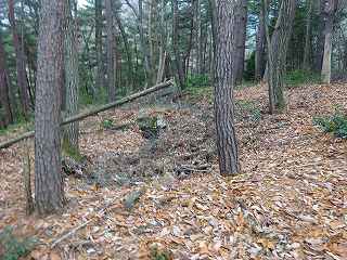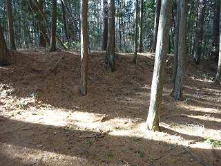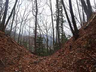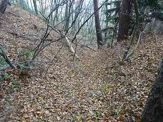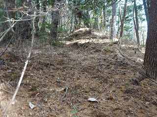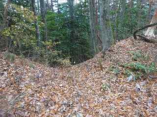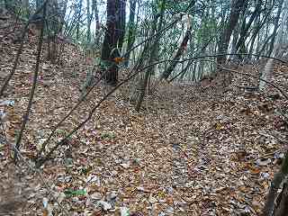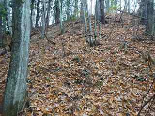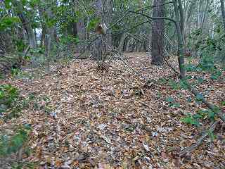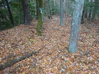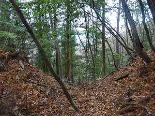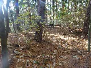 | 分岐点から見ると、山道が見えている。「道があるのか」と思って進んで行ったのだが、すぐに道はなくなる。それでもヤブではないので比較的歩きやすい。 | 尾根の途中にはこのような竪堀が何本か見られる。 |