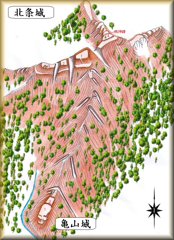 亀山城は、金松寺の北側にそびえる比高30mほどの山稜先端部に築かれていた。この亀山城から尾根続き北側に登って行ったところにある比高200mほどの山稜が北条城の跡である。