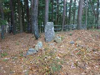 そこから東側に進んで行ったところが4郭である。緩やかなピーク部だったものを削平したようで、4郭はそれほど広くなく、周囲には腰曲輪が巡らされている。4郭内部には石碑が1つ祭られていたのだが、これは城址碑ではなく、鳴神を祭ったものであった。