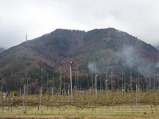 | 梓川の南側から遠望する城日影砦。鉄塔の建っているあたりの西側だと思う。 | |