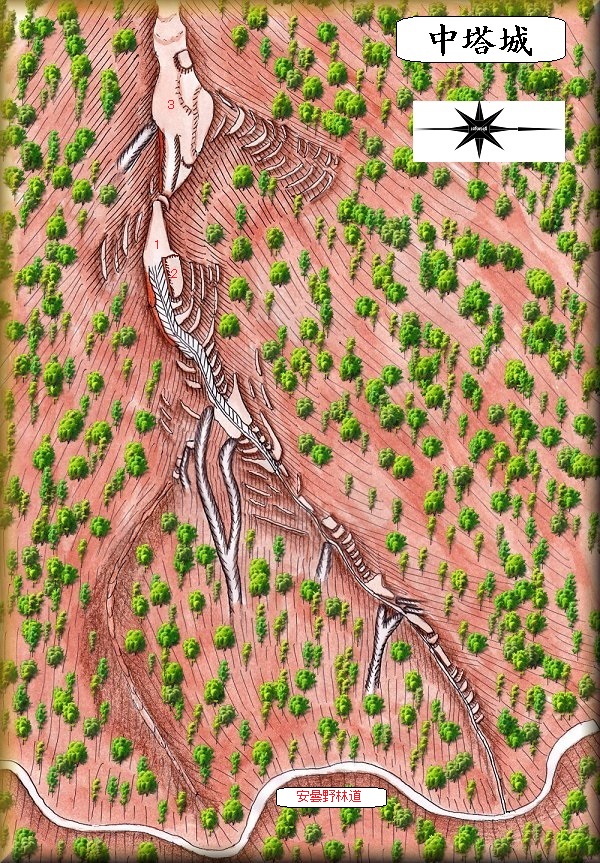 中塔城は、尖屋敷の西方1kmほどのところにある比高440mほどの山稜に築かれていた。