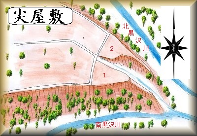 尖屋敷は、北黒沢川と南黒沢川とが合流する地点にある細長く三角形で比高20mほどの台地先端部にあった。