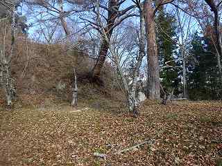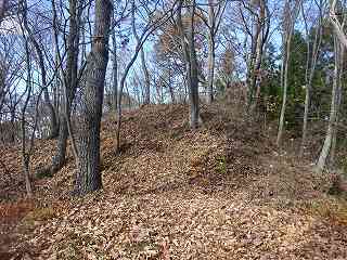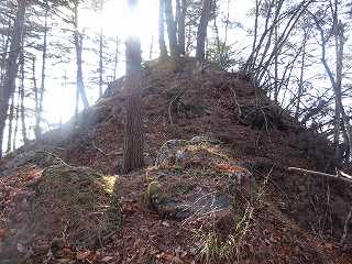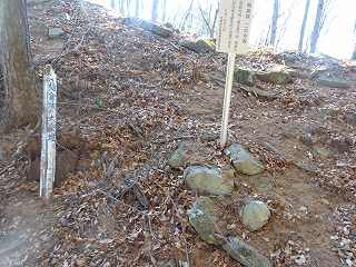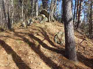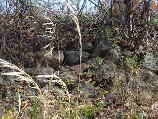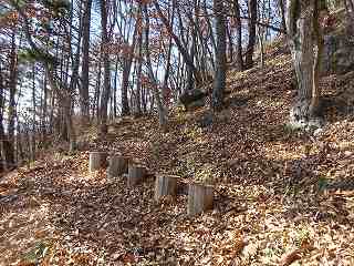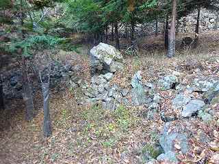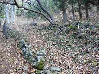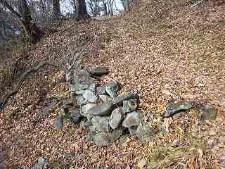 堀切を越えたところの通路側面部には石積みが見られた。信州の山城では時々石積みが見られるが、それほど岩場のないこのような山城にも石積みが見られるというのがちょっと意外であった。