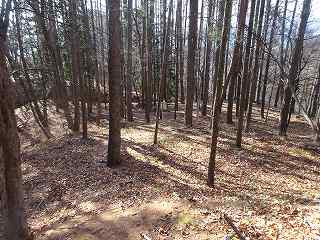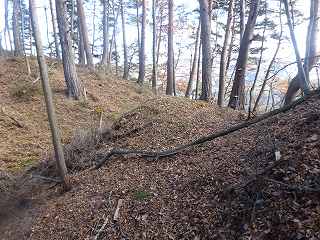 ここから北側は尾根続きになっている。尾根が下に降って行く箇所に、2か所の堀切が掘られていて防御を固めている。その先には平坦な尾根がしばらく続いていて、やがて地勢が上がって行くところに最後の堀切があった。これもセオリー通りであり、この堀切が城域の末端部を示すものである。
