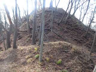 この堀切は上端幅が20mほどもある大きなもので、中央部にはしっかりとした土塁が構築されて二重堀切を形成している。そして、この堀切の外側から見る1郭の城塁が非常に威圧的にそびえて見える。これはまた、見事な光景である。今回の信州遠征で訪れた数多くの城郭の中でも、もっとも印象的な光景がここであった。とても素晴らしい。登ってきた疲れを一挙に吹き飛ぶほどの眺めといっていい。